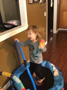 Tiger teeth. This is the name we’ve given to your face when you clench your teeth together and pull your lips back. Sometimes you’ll squeeze (or try to pinch) my hand while you make this expression. Other times the expression comes and goes as you jump.
