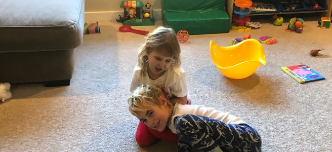 Tate returned to his important play—teaching Coral how to evade a kidnapper. I decided to save the talk on Coral’s high pain tolerance and her different sensory needs (why she loved the wrestling and wasn’t getting upset or crying, as Tate thought she might) for later that day.
